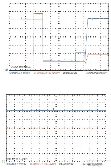 圖2顯示了保護功能的作用過程。輸出B有一個300mA的恒定負載,輸出A則在100mA負載和600 mA負載之間切換。當出現(xiàn)一個過載時,輸出A被關(guān)斷,但有一個20 ms的延遲,以避免對短時的瞬流作出響應(yīng)(圖2a)。電路在80 ms后消除過載;再經(jīng)過20 ms的延遲,自動重啟功能使輸出A重新連線。輸出B根本察覺不到輸出A的問題(圖2b)。不過,故障指示輸出端變?yōu)榈?,表示通道A有一個問題。