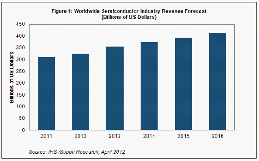 預(yù)計2012年半導(dǎo)體營業(yè)收入將達到3246億美元,比去年的3114億美元增長4%。與去年1%的增長率相比,今年增長情況有所改善,而且所有信號都顯示,隨著全球經(jīng)濟趨于穩(wěn)定,半導(dǎo)體產(chǎn)業(yè)將重新站穩(wěn)腳跟。除非全球市場出現(xiàn)意外的經(jīng)濟下滑或者半導(dǎo)體產(chǎn)業(yè)出現(xiàn)重大失策,否則營業(yè)收入未來幾年將繼續(xù)上升,到2016年將達到4128億美元左右,如圖1所示。