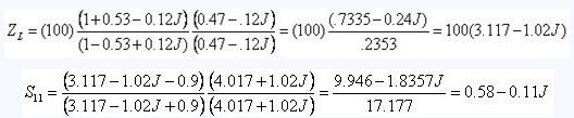 舉個例子,用100歐姆阻抗表征的復(fù)合回波損耗S11=0.53-0.12J轉(zhuǎn)換到90歐姆的如下: