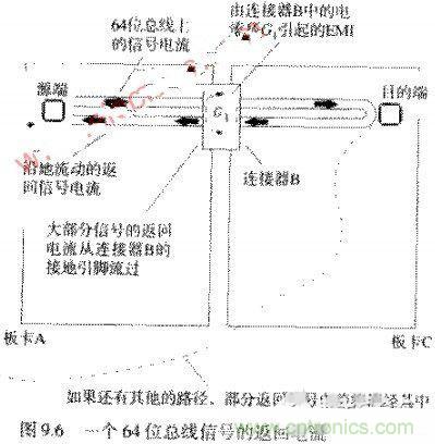 圖9.6舉例說(shuō)明了一個(gè)普通的電磁干擾問(wèn)題。一個(gè)64位總線從板卡A經(jīng)過(guò)連接器B連到母板卡上,母板卡可能是一個(gè)主CPU卡或是一個(gè)通往其他子卡的無(wú)源通道。64條信號(hào)線的返回電流從母板卡C流回板卡A,其中的絕大部分通過(guò)了連接器B的接地腳。