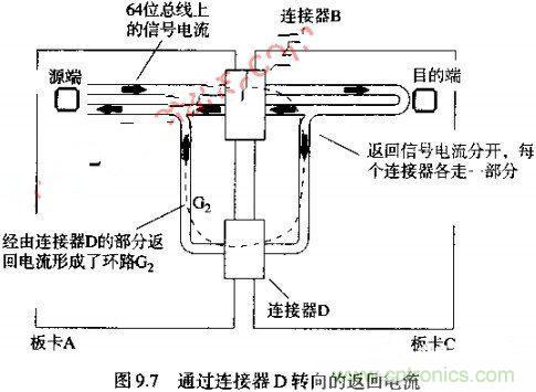 例如,在圖9.7中,假設(shè)板卡A和C共用兩個(gè)連接器,另外增加的連接器記為D,將其安排在與連接器B相隔一段距離的地方。現(xiàn)在有一部分信號(hào)的返回電流可以由連接器D上的地線流加A,如圖9.7中的環(huán)路G2所示。