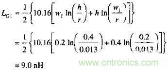 在圖9.6中,環(huán)路面積上的氣泡一般發(fā)生在連接器B內(nèi),因?yàn)檫B接器上的信號(hào)和地線引腳是分開(kāi)的。該氣泡記為G1,64位總線信號(hào)路徑的環(huán)路電感大部分來(lái)自環(huán)路G1的電感。