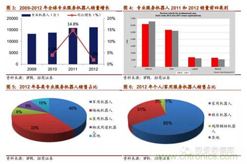 根據(jù)IFR2013年世界服務機器人統(tǒng)計報告,服務機器人2012年總銷量為301.6萬臺,總銷售額為46.2億美元。其中個人/家用服務機器人銷量為300萬臺,環(huán)比上升20%,總銷售額為12億美元;專業(yè)服務機器人2012年總銷量為16067臺,環(huán)比增長2%,銷售額為34.2億美元。