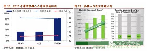 掃地機器市場具有巨大的潛力,增長勢頭強勁。13年家庭掃地機器人市場規(guī)模大于12億美元,過去三年復合增長率達21.8%。掃地機器人對傳統(tǒng)掃地設備的替代率不斷提高,13年占掃地設備市場18.1%。