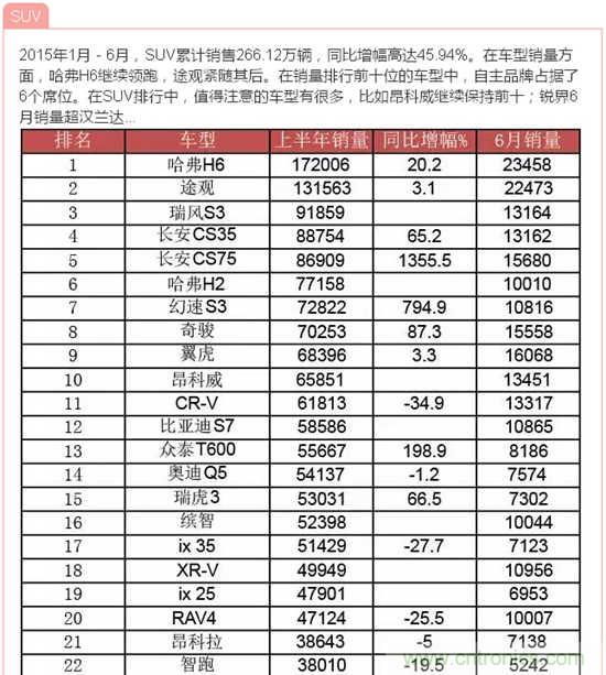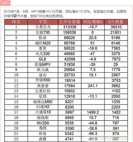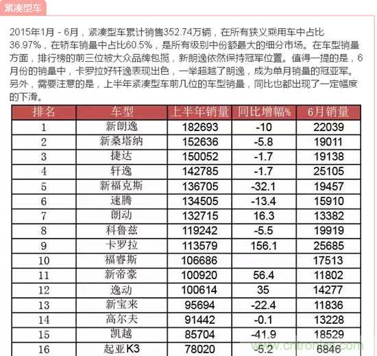 據(jù)中國汽車工業(yè)協(xié)會發(fā)布的數(shù)據(jù),2015年6月,汽車產(chǎn)銷量環(huán)比下降,同比繼5月后再次雙雙下降;上半年,汽車產(chǎn)銷增速比上年同期明顯回落。說到汽車,小編想到了由我愛方案網(wǎng)承辦的“創(chuàng)業(yè)之星”2015全球創(chuàng)客大賽成都賽場中的一個參賽項目:智能車載太陽能轉(zhuǎn)化防護(hù)裝置,它改變原先由人工罩車費時費力方法,完全達(dá)到遙控自動罩車,屬于汽車產(chǎn)品領(lǐng)域的一項新技術(shù),歡迎大家到淘方案上了解詳情!下面跟著小編來看看中國汽車在2015年1月-6月的銷量數(shù)據(jù)!歡迎參與互動分享!