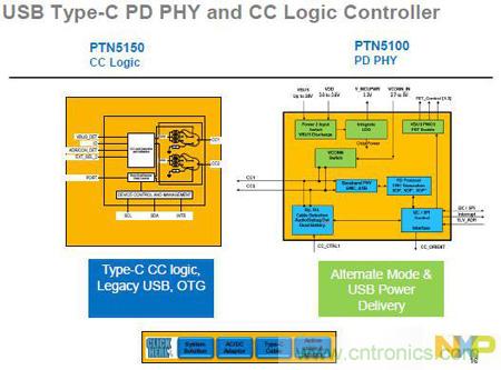 不同的應用場景,不同的復雜度層次,NXP有不同的產品和方案來搭配,為設計者提供達到系統(tǒng)最佳化的方案。下圖中展示了NXP的CC邏輯控制和PD PHY方案。吳韶阡介紹說,如果是低于15W的供電,或者是不需要支持多功能的設計,可以采用簡單的CC邏輯控制;而一個完整的USB Type-C方案就需要使用完整的PD方案,相應的元器件也會增加。