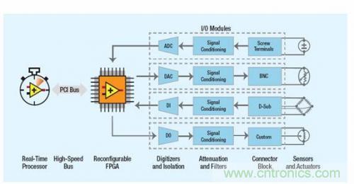 圖2 - NI LabVIEW的可重配置I/O(RIO) 架構(gòu)基于四大組件之上:如處理器、可重配置FPGA、模塊化I/O硬件和圖形設(shè)計(jì)軟件。