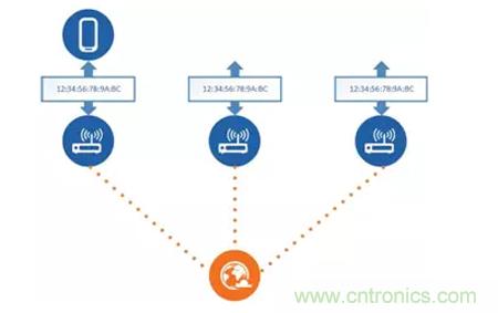 我們可以試想一下,當(dāng)我們每天搭乘公共交通穿行了整個(gè)城市,當(dāng)我們?cè)谏虉?chǎng)購(gòu)物或是和朋友在餐廳聚餐的時(shí)候,你的智能手機(jī)可以幫助你付費(fèi)、點(diǎn)單和導(dǎo)航。如果你的智能手機(jī)接入到網(wǎng)絡(luò)熱點(diǎn)當(dāng)中進(jìn)行互聯(lián)網(wǎng)訪問(wèn)的時(shí)候,它就可能會(huì)在這一系列的過(guò)程當(dāng)中來(lái)廣播其MAC地址。我們前面提到了MAC地址在網(wǎng)絡(luò)通信當(dāng)中的唯一性,你又是智能手機(jī)的使用者,那么這部智能手機(jī)的MAC地址從某一角度來(lái)講,就代表了你在無(wú)線通信過(guò)程當(dāng)中的身份認(rèn)證。因此就存在這樣一種可能,一些懷有惡意的人通過(guò)一些其他的無(wú)線通信設(shè)備,可以獲取你的智能手機(jī)進(jìn)行數(shù)據(jù)交互時(shí)的MAC地址并且記錄了MAC地址出現(xiàn)的日期、時(shí)間和相關(guān)的位置,那么你的行蹤就可以被監(jiān)控,如下圖所示。