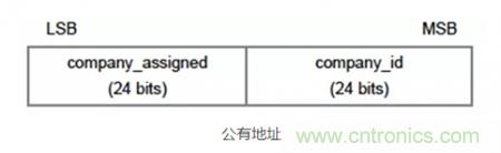 公有地址的構(gòu)成包含了兩個(gè)部分,一部分是公司識(shí)別碼(Company ID),其需要通過(guò)IEEE注冊(cè)機(jī)構(gòu)付費(fèi)獲得,公司識(shí)別碼長(zhǎng)度為24比特,處于48比特設(shè)備地址的高24比特;另外一部分是公司分配碼(Company Assigned ID),其長(zhǎng)度也為24比特,處于48比特設(shè)備地址的低24bit,如下圖所示。