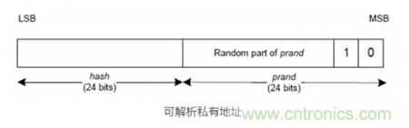 假設(shè)有兩個(gè)藍(lán)牙設(shè)備,分別是設(shè)備A和設(shè)備B,在兩個(gè)藍(lán)牙設(shè)備A、B建立連接之后,這兩個(gè)藍(lán)牙設(shè)備可以通過(guò)配對(duì)的方式交換各自的身份解析密鑰IRK(Identity Resolving Key, IRK),設(shè)備A的身份解析密鑰IRK-A,設(shè)備B的身份解析密鑰IRK-B。假設(shè)設(shè)備B采用了可解析的私有地址機(jī)制,那么設(shè)備B就需要周期性的產(chǎn)生可解析的私有地址。下圖是可解析隨機(jī)地址的結(jié)構(gòu),其中可解析隨機(jī)地址的高兩個(gè)比特分別為0和1,作為可解析地址的標(biāo)識(shí)符。