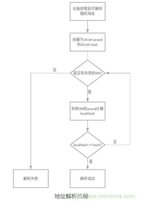 如果生成的本地哈希localHash與拆分得到的哈希hash相等,說(shuō)明這個(gè)地址是設(shè)備B所產(chǎn)生的可解析隨機(jī)地址;如果不等,代表解析失敗。設(shè)備A可以利用其獲取的其他設(shè)備的IRK對(duì)這個(gè)地址就行解析。下圖是一個(gè)地址解析的流程圖。