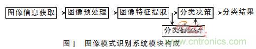 圖像識別技術(shù)是利用計算機視覺采集物理對象,以圖像數(shù)據(jù)為基礎(chǔ),讓機器模仿人類視覺,自動完成某些信息的處理功能,達到人類所具有的對視覺采集圖像進行識別的能力,以代替人去完成圖像分類及識別的任務(wù)。圖像模式識別系統(tǒng)通常由五個模塊組成,如圖1所示。
