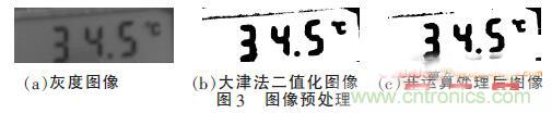 由上圖2所示,得到的圖像是彩色圖像,由于光照強度等原因,液晶屏圖像中常有許多噪聲點。為了得到精確圖像,本文對圖像進行灰度化處理、大津法二值化處理和開運算處理。下圖3中(a)、(b)和(c)分別為灰度化處理、大津法二值化處理和開運算處理后的結(jié)果。