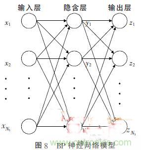 三層BP神經(jīng)網(wǎng)絡(luò)的模型如圖8所示,包括輸入層、隱含層和輸出層,各層間由連接權(quán)值構(gòu)成。BP神經(jīng)網(wǎng)絡(luò)的訓(xùn)練過程由信號的正向傳播和誤差的反向傳播兩個過程組成,其學(xué)習(xí)的本質(zhì)是各連接權(quán)值的動態(tài)調(diào)整。隨著網(wǎng)絡(luò)的不斷學(xué)習(xí),權(quán)值也不斷的調(diào)整,直到誤差減少到可接受的程度或者訓(xùn)練達到預(yù)定的訓(xùn)練次數(shù)。