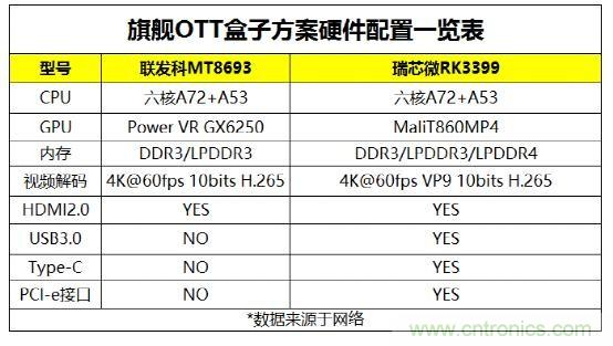 超高規(guī)CPU與GPU,可秒殺目前市場(chǎng)主流的海思Hi3798、海思3798C V200、全志H8、晶晨S905、聯(lián)發(fā)科MT8693等產(chǎn)品。而性能與RK3399差距不算太大的晶晨S912,目前量產(chǎn)時(shí)間仍待定,因此在整體盒子芯片環(huán)境中,RK3399目前尚無(wú)對(duì)手。