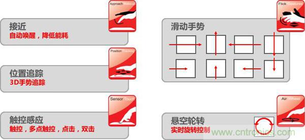 其中比較有代表性的,要數(shù)Microchip公司的GestIC技術。它基于電場感應的原理,在電子設備周邊的空間中形成一個電場。當手部在空間中運動時會使電場發(fā)生畸變,布設在電場中的電極接收器會感應到這種變化,并通過專門的控制芯片進行信號處理,對手勢進行識別和運動追蹤,并將數(shù)據(jù)傳遞給電子設備做出響應。Microchip代理商世健公司產(chǎn)品經(jīng)理介紹,與采用攝像頭的光學3D手勢識別技術相比,GestIC技術最大的優(yōu)勢在于功耗極低,能耗節(jié)省多達90%,同時能避免環(huán)境光等外部因素的干擾,雖然是一個近場識別技術,但其在家庭自動化、家電控制、音響系統(tǒng)、電腦及配件、汽車電子等方面,會有諸多應用場景。