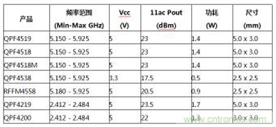 新的Qorvo FEM支持最新一代802.11ac和Wave 2 1024QAM家居Wi-Fi產(chǎn)品,功耗比現(xiàn)今市面同類產(chǎn)品低2瓦特。這足以使一些Wi-Fi聯(lián)網(wǎng)設(shè)備的風(fēng)扇變得不必要,進(jìn)一步降低功耗,減小尺寸。5 GHz FEM現(xiàn)在提供樣片;2.4 GHz型號將在2017年一季度推出。下表總結(jié)了新Qorvo Wi-Fi FEM系列的規(guī)格。