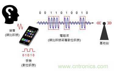 現(xiàn)在的手機(jī)是屬于「數(shù)字通信」,也就是我們講話的聲音(連續(xù)的模擬信號(hào)),先由手機(jī)轉(zhuǎn)換成不連續(xù)的 0 與 1 兩種數(shù)字信號(hào),再經(jīng)由數(shù)字調(diào)變轉(zhuǎn)換成電磁波(模擬信號(hào)載著數(shù)字信號(hào)),最后從天線傳送出去,原理如圖一所示。
