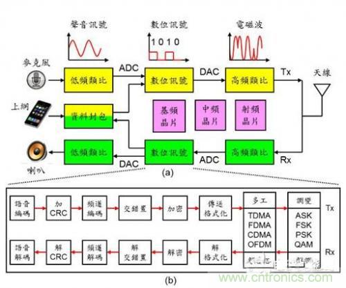 數(shù)字通信系統(tǒng)的架構(gòu)如圖二(a)所示,使用者可能使用智能型手機(jī)打電話進(jìn)行語音通信或上網(wǎng)進(jìn)行數(shù)據(jù)通信,我們分別說明如下: