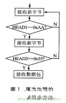 此種方法代碼量小,編程簡(jiǎn)單,一般用于在主程序中以非中斷方式接收串口數(shù)據(jù)、實(shí)時(shí)性很差、數(shù)據(jù)幀較短的場(chǎng)合。但是,在串口速度過(guò)快且包頭字節(jié)數(shù)比較多的情況下,串口實(shí)現(xiàn)同步花費(fèi)的時(shí)間很長(zhǎng)或很難實(shí)現(xiàn)同步。例如,串口接收到序列Ox0O OxAA0xAA 0x55…,當(dāng)遇到第一個(gè)“0xAA”時(shí),該方法認(rèn)為第1個(gè)字節(jié)正確開(kāi)始比較第2個(gè)同步頭。第2個(gè)字節(jié)仍是“0xAA”而不是“0x55”,所以必須等待新的字節(jié)重新開(kāi)始比較第1個(gè)同步頭。而緊隨其后的是“0x55”,因而,此時(shí)包頭的第1個(gè)字節(jié)也沒(méi)有同步上。事實(shí)上,“0x00 OxAA”是干擾字節(jié),“0xAA 0x55”才是通信協(xié)議中的同步頭。