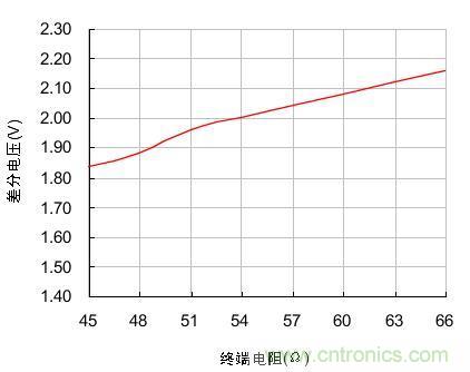 在負(fù)載電阻由45Ω不斷增大到66Ω時(shí),節(jié)點(diǎn)的輸出差分電壓也隨著由1.84V增大到2.16V,兩者近似線性關(guān)系。為了使發(fā)送節(jié)點(diǎn)的輸出差分電壓不至于過(guò)低,實(shí)際組網(wǎng)時(shí)負(fù)載電阻應(yīng)在圖 1測(cè)試的范圍內(nèi)波動(dòng)。我們分析RL的組成有3個(gè):終端電阻、總線節(jié)點(diǎn)的差分輸入電阻、總線本身的有效電阻。