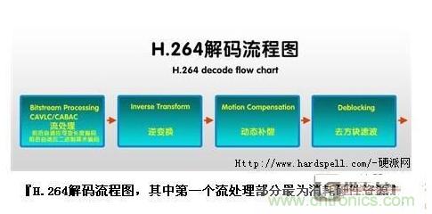 那么究竟高清編碼的步驟有哪些,哪些又是負(fù)載最高的部分呢?以H.264視頻舉例而言,分為四個主要部分(見下圖)。圖中的四個方塊基本就是H.264解碼的四個最主要步驟,也是資源消耗的主要四個部分,其中又以第一步的“CAVLC/CABAC解碼”最為消耗運(yùn)算資源,這方面遠(yuǎn)高于其他三步(簡單的說,CAVLC/CABAC是H.264編碼規(guī)范中兩種不同的算法,際俏了提高壓縮比,其中CABAC比CAVLC壓縮率更高,但解碼時自然也要求更高)。
