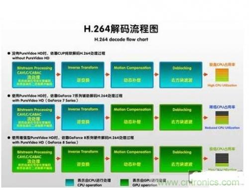 通過具有H.264硬件解碼引擎的顯卡,就可以完成H.264編碼的全部4個處理步驟(圖解第三行),也就是實現(xiàn)全程解碼,這就是它們能讓H.264高清視頻播放的CPU占用率大幅度下降的根本原因。既然顯卡完成了所有的高清解碼處理,那么CPU自然就空閑了。而我們所謂的部分解碼,就是CPU仍然承擔(dān)一定的處理任務(wù),因此占用率仍然要高出不少。