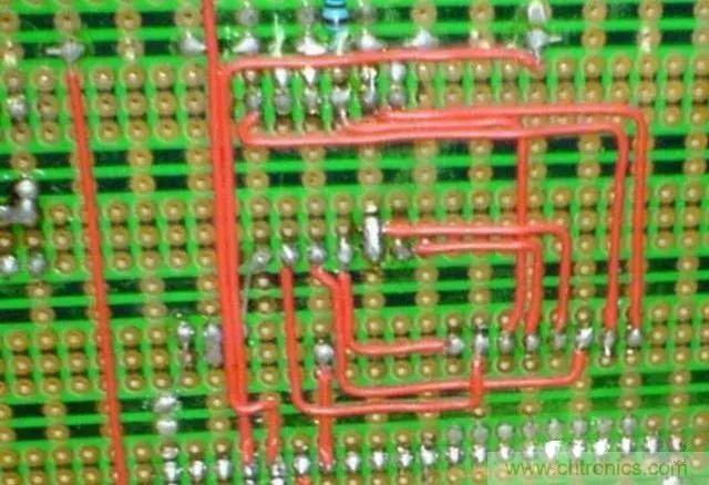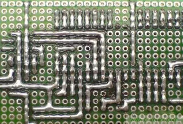 網(wǎng)上還流行一種方法叫錫接走線法,如下圖所示,工藝不錯(cuò),性能也穩(wěn)定,但比較浪費(fèi)錫。純粹的錫接走線難度較高,受到錫絲、個(gè)人焊接工藝等各方面的影響。如果先拉一根細(xì)銅絲,再隨著細(xì)銅絲進(jìn)行拖焊,則簡(jiǎn)單許多。洞洞板的焊接方法是很靈活的,因人而異,找到適合自己的方法即可。