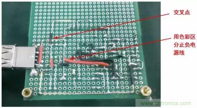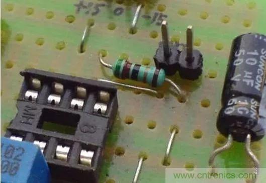 洞洞板的焊接需要大量的跨接、跳線等,不要急于剪斷元器件多余的引腳,有時(shí)候直接跨接到周圍待連接的元器件引腳上會(huì)事半功倍。另外,本著節(jié)約材料的目的,可以把剪斷的元器件引腳收集起來作為跳線用材料。