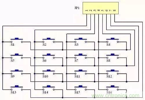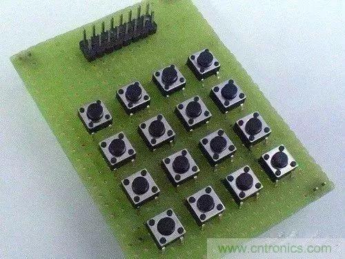 圖a是矩陣鍵盤電路,圖b是筆者焊接的矩陣鍵盤。這是一個(gè)利用了元器件自身結(jié)構(gòu)的典型例子:圖b中的輕觸式按鍵有4只腳,其中兩兩相通,我們便可以利用這一特點(diǎn)來簡(jiǎn)化連線,電氣相通的兩只腳充當(dāng)了跳線。讀者可以對(duì)照?qǐng)Dc好好體會(huì)一下。