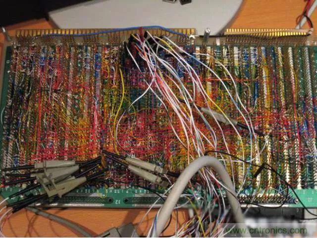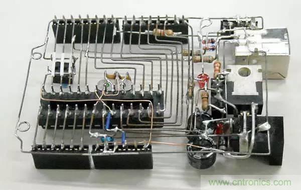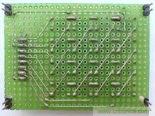 對(duì)于元器件在萬能板上的布局,大多數(shù)人習(xí)慣“順藤摸瓜”,就是以芯片等關(guān)鍵器件為中心,其他元器件見縫插針的方法。這種方法是邊焊接邊規(guī)劃,無序中體現(xiàn)著有序,效率較高。但由于初學(xué)者缺乏經(jīng)驗(yàn),搭出來的板是這樣的……