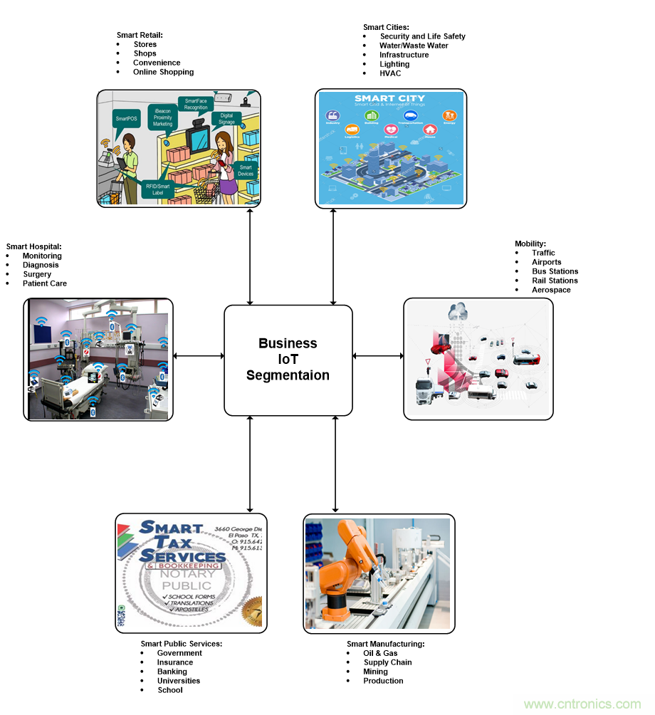 企業(yè)物聯(lián)網(wǎng)的覆蓋范圍巨大,包括零售、醫(yī)療、能源、出行、城市、制造業(yè)和公共服務(wù)。企業(yè)物聯(lián)網(wǎng)細分市場會改變組織和社區(qū),從而創(chuàng)造一個實現(xiàn)經(jīng)濟增長的新時代。物聯(lián)網(wǎng)通過連接數(shù)據(jù)、人員和機器來提高生產(chǎn)力、生產(chǎn)效率以及日常運營水平。企業(yè)物聯(lián)網(wǎng)也可以作為幫助企業(yè)識別未開發(fā)領(lǐng)域新增長機會的工具。