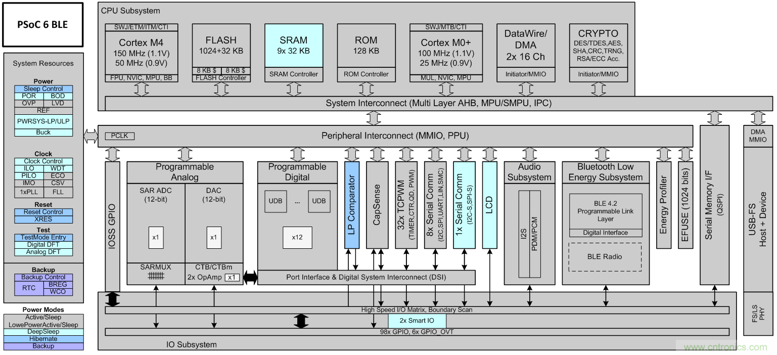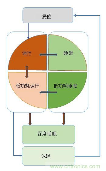 在考慮 MCU 的功耗模式時,超越其基本架構(gòu)十分重要。例如,標準 ARM CPU 內(nèi)核支持運行、睡眠和深度睡眠。附加功耗模式通常由特定的 MCU 供應(yīng)商添加。例如,賽普拉斯的 PSoC 6 BLE MCU可執(zhí)行包括,低功耗運行、低功耗睡眠和休眠狀態(tài)在內(nèi)的六種工作功耗模式。