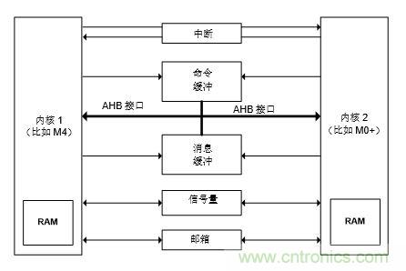 消息隊列:消息隊列使用共享內(nèi)存的兩個區(qū)域來存儲每個核心發(fā)送給另一個核心的消息。第一個區(qū)域是被稱為命令緩沖器的專用存儲器,用于存儲從主機發(fā)送到從機的命令。另一個專用存儲器被稱為消息緩沖器,它使從機能夠響應(yīng)主機。