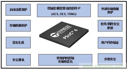 由于許多物聯(lián)網(wǎng)系統(tǒng)會處理用戶的個人數(shù)據(jù),因此確保數(shù)據(jù)的安全尤為重要。代碼存儲器也同樣需要保護,以防止設(shè)備被非法入侵。外部存儲器在安全性方面更加脆弱,因此需要特殊的機制來保護外部存儲的數(shù)據(jù)。為此,MCU 使用各種加密技術(shù)(例如 AES、DES、RSA)來保護數(shù)據(jù)和代碼免受非法訪問。例如,賽普拉斯半導體的 PSoC 6 BLE MCU 提供了一個特殊的串行存儲器接口(SMIF)外設(shè),該外設(shè)支持直接執(zhí)行外部代碼的 XIP(現(xiàn)場執(zhí)行)模式和記錄數(shù)據(jù)的 MMIO(內(nèi)存映射 IO)模式。它使用特殊命令進行控制,比如閃存的編程/擦除、存儲器設(shè)備的睡眠模式輸入等。