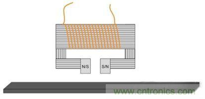 在實用化系統(tǒng)中需要用到一個寫入磁頭,它其實就是繞在磁心上的一個線圈。通過控制線圈中的電流方向可以很容易編程磁場方向。這有助于在磁卡上形成南北極圖案。磁極之間的空隙越窄,磁卡上能夠編程的數(shù)據(jù)密度就越高。
