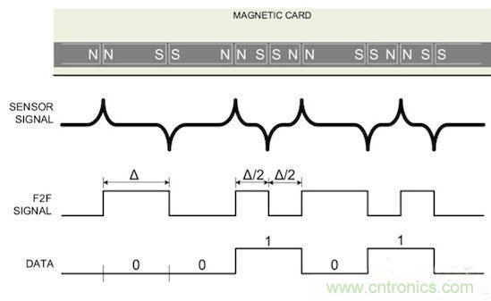讀過程正好相反,它需要使用一個結(jié)構(gòu)上與圖2所示的線圈-磁芯相同的讀卡頭。需要注意的是,每個磁道要有一個傳感器。在劃卡時,源自磁條的磁場將在讀卡頭線圈中感應(yīng)出電壓。圖5顯示了從讀卡頭得到的波形。