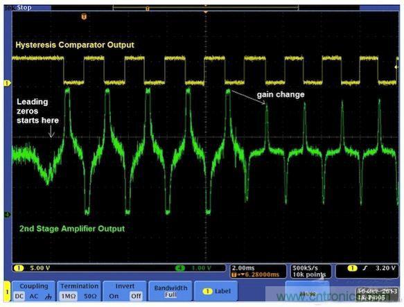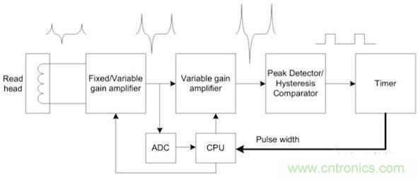 圖6顯示了一個完整的系統(tǒng)。最好將放大電路做成兩級,用ADC接收第一級電路的輸出。這樣就無需高分辨率ADC,8位ADC就足以滿足這種應(yīng)用需求。第一級可以是固定增益的放大器,也可以是可變增益放大器。第二級是可變增益放大器。CPU讀取ADC結(jié)果,并通過調(diào)整增益使第二級放大器的信號輸出達到最佳。第二級放大器的輸出送到峰值檢測器/磁滯比較器電路進行峰值檢測。來自檢測器的脈沖輸出被饋送至定時器進行時間差測量,然后由CPU解碼出1和0。