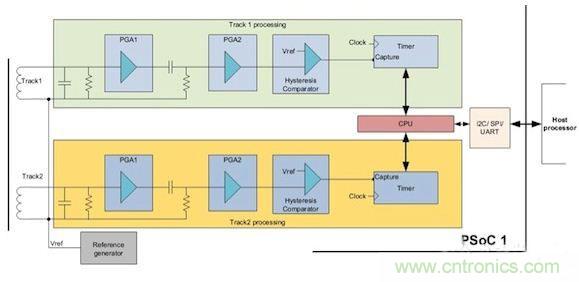 圖9顯示了基于賽普拉斯PSoC 1的雙磁道磁卡讀卡器實現(xiàn)方案。PSoC 1處理器具有與8位處理器內(nèi)核集成在一起的可配置模擬和數(shù)字塊,在單顆芯片上集成了所有的功能。需要注意的是,圖中所示的無源器件是在處理器的外部。