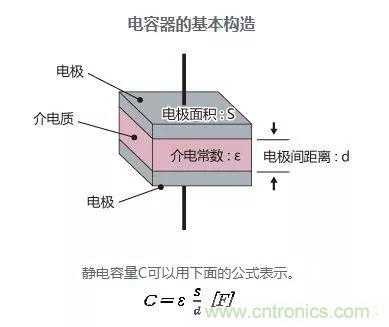 普通電容器由2枚電極(金屬板)和中間夾著的介電質(zhì)組成。一旦施加電壓,電子就聚集在一個(gè)電極上,是儲(chǔ)存電荷的狀態(tài)。此時(shí)電極間的介電質(zhì)通過「介電分極」現(xiàn)象,發(fā)揮增加靜電容量的作用。