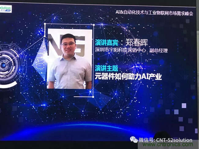為積極推動(dòng)跨行業(yè)的電子開發(fā)需求與方案服務(wù)商的對接,大力發(fā)展技術(shù)外包服務(wù),服務(wù)國家創(chuàng)新戰(zhàn)略,搶占人工智能技術(shù)和應(yīng)用的制高點(diǎn),近日,我愛方案網(wǎng)策劃主辦了2018AI&自動(dòng)化技術(shù)與工業(yè)物聯(lián)網(wǎng)市場需求峰會(huì),這是第六屆中國電子信息博覽會(huì)的核心活動(dòng)。中國優(yōu)秀的元件技術(shù)供應(yīng)商宇陽科技副總鄭春暉在峰會(huì)上做《元器件如何助力AI產(chǎn)業(yè)》的大會(huì)報(bào)告。