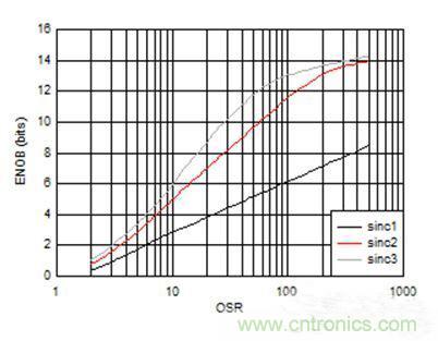 圖1:AMC1304L05 —— 有效位數(shù)和過采樣率