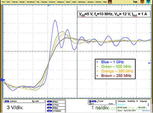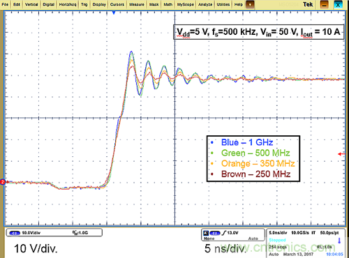 從[1]可清楚看出,可用的最高系統(tǒng)帶寬低于基于EPC8009的設(shè)計(jì)的振鈴頻率?,F(xiàn)在我們將觀察選擇不同的系統(tǒng)帶寬如何影響采用更高速的GaN晶體管(如EPC8009)和相對(duì)較慢的GaN晶體管(如EPC2045和EPC2022)的開關(guān)節(jié)點(diǎn)波形。