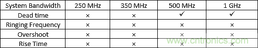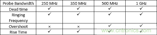 采用EPC8009的設(shè)計(jì)所測(cè)量到的振鈴頻率(fr1)為1.176GHz,它采用最高帶寬1GHz的探頭。圖2(頂部)中顯示的較低帶寬情況進(jìn)一步降低了測(cè)量振鈴頻率的準(zhǔn)確性。當(dāng)考慮峰值電壓過沖時(shí),同樣很明顯的是,較低帶寬測(cè)量值會(huì)低估各個(gè)開關(guān)器件的峰值電壓。對(duì)于與時(shí)序相關(guān)的死區(qū)時(shí)間的測(cè)量,系統(tǒng)帶寬也很重要。如圖2(頂部)所示,對(duì)于500MHz和1GHz帶寬,死區(qū)時(shí)間是可見的,雖然測(cè)量來并不是很精確。在較低帶寬下,死區(qū)時(shí)間幾乎不存在。表1顯示了采用最高速的EPC8009,系統(tǒng)帶寬對(duì)關(guān)鍵測(cè)量結(jié)果的影響。