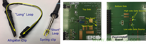 本節(jié)測(cè)量技術(shù)使用EPC9080半橋演示板。開關(guān)節(jié)點(diǎn)波形在圖3所示的兩點(diǎn)測(cè)量:靠近FET開關(guān)節(jié)點(diǎn)的“近點(diǎn)”;以及PCB外圍引腳端子處的“遠(yuǎn)點(diǎn)” 。圖4顯示了每個(gè)探測(cè)點(diǎn)和配以探頭技術(shù)所測(cè)量的開關(guān)節(jié)點(diǎn)(VSW)的波形。