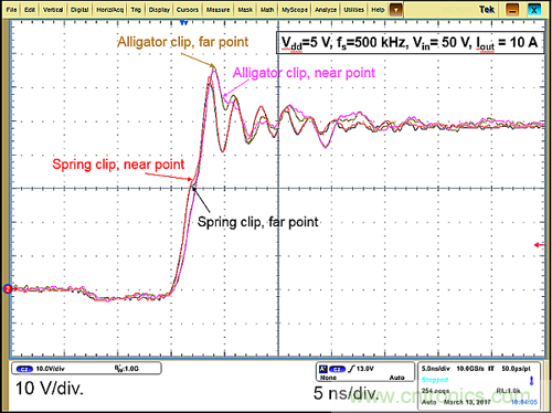 圖4的測(cè)得波形清楚地表明,探頭技術(shù)比測(cè)量點(diǎn)的選擇重要。雖然有邊緣衰減,紅色和黑色波形幾乎相同。無(wú)論測(cè)量點(diǎn)的選擇如何,使用鱷魚夾時(shí)的波形形狀都非常不準(zhǔn)確。我們建議,彈簧夾技術(shù)應(yīng)與最靠近功率器件的測(cè)量點(diǎn)(“近點(diǎn)”)結(jié)合使用。