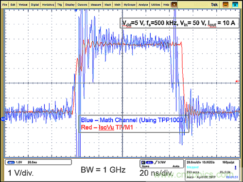 圖5顯示了對(duì)EPC9080板的高側(cè)柵-源極信號(hào)(VGS1)進(jìn)行的示波器數(shù)學(xué)技術(shù)和隔離測(cè)量系統(tǒng)之間的測(cè)量結(jié)果的差異(圖1)。