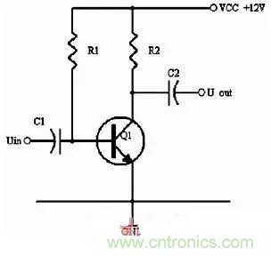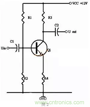 同理,當輸入信號減小時,則Ib減小,Ic電流減小,則電阻R2的電壓U2=Ic×R2會隨之減小,Uce=VCC-U2,會變大。在輸入信減小時,Uce最大變化是從1/2的VCC變化到VCC。這樣,在輸入信號一定范圍內(nèi)發(fā)生正負變化時,Uce以1/2VCC為準的話就有一個對稱的正負變化范圍,所以一般圖1靜態(tài)工作點的設置為Uce接近于電源電壓的一半。