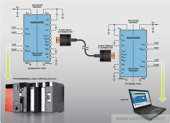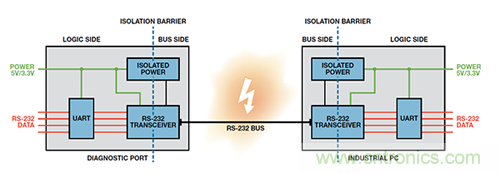 要提供隔離式 RS-232 通信接口,兩端的器件必須與所連的RS-232 電纜相互隔離。要隔離數(shù)據(jù)鏈路,則必須對數(shù)據(jù)信號線路和用于驅(qū)動該電纜的電源進行隔離。來自診斷端口上UART 的數(shù)據(jù)需要跨越隔離柵并傳輸至隔離總線側(cè)上的RS-232 收發(fā)器。本地 5 V/3.3 V 電源也需要跨越隔離柵來為隔離總線側(cè)上的 RS-232 收發(fā)器供電。工業(yè) PC 端也同樣需要如此:數(shù)據(jù)和電源均需要跨越隔離柵(圖 3).通過將器件與 RS-232 電纜網(wǎng)絡(luò)隔離開來,診斷端口和工業(yè) PC電路均受到保護,不受惡劣環(huán)境下可能耦合到 RS-232 電纜上的瞬變影響。隔離還可以中斷因診斷端口和工業(yè) PC 端存在不同接地電位而可能出現(xiàn)的接地環(huán)路。RS-232 總線上可能出現(xiàn)的高共模電壓不能跨越隔離柵,從而保護隔離數(shù)據(jù)的用戶。