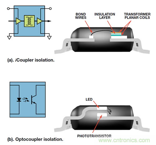 圖 4 比較了兩種主要隔離技術(shù)。iCoupler 技術(shù)(圖 4(a))利用厚膜工藝技術(shù)構(gòu)建可實現(xiàn) 2.5 kV 隔離的微型片上變壓器,從而在 RS-232 系統(tǒng)中提供信號隔離。較古老但廣泛采用的光耦合器解決方案(圖 4(b))則采用發(fā)光二極管(LED)和光電二極管。LED 用于將電信號轉(zhuǎn)換為光,光電檢測器則用于將光轉(zhuǎn)換回為電信號。電光轉(zhuǎn)換本身的低轉(zhuǎn)換效率導(dǎo)致功耗相對較高;光電檢測器的慢速響應(yīng)則限制其速度;而老化問題會限制其使用壽命。